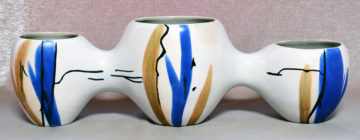 Il Vaso a tre bocche è formato da tre vasi di forma ovoidale e differenti dimensioni saldati gli uni agli altri, creando un movimento fluido dato dall’espansione e dalla contrazione dei volumi. L’esemplare in esame è dipinto a mano con smalti ocra, blu e nero stesi attraverso pennellate dal forte impatto gestuale, con andamento verticale o orizzontale, che denunciano una chiara influenza da parte della pittura informale contemporanea. L’opera, nella versione tinta unita bianca, venne esposta in occasione della IX Triennale di Milano del 1951.