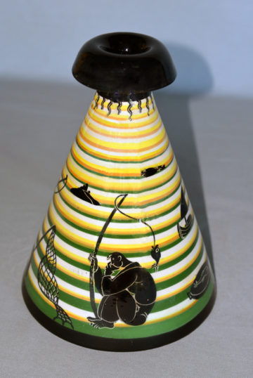 La manifattura ceramica di Umbertide venne fondata nel 1927 da Settimio Rometti e dal nipote Aspromonte con lo scopo di dar vita a una produzione moderna, capace di superare le forme eclettiche della tradizione locale sulla scorta della lezione delle avanguardie. Le idee dei due fondatori trovano effettiva realizzazione nel 1928, quando entrò nella società un altro nipote di Settimio, Dante Baldelli, che aveva studiato all’Accademia di Belle Arti di Roma ed era entrato in contatto con diversi artisti attivi nella capitale. Tra questi, vi era anche il pittore Corrado Cagli, che tra il 1928 e il 1930 collaborò con la manifattura Rometti, introducendo nuove forme e originali decori evidentemente influenzati dal suo stile pittorico oscillante tra il monumentalismo di Novecento e il dinamismo futurista. Accanto alle invenzioni più vicine alle esperienze avanguardiste e ai temi propagandistici di influenza fascista, Cagli ideò una serie di soggetti tratti dal mondo popolare e contadino, che declinò con fantasia su oggetti d’uso tradizionale ma dalle forme nuove e originali. Tra i motivi ricorrenti vi sono le scene marine con i pescatori, arricchite da particolari aneddotici che aiutano a contestualizzare i personaggi e a ritmare lo spazio, dando anche un vago senso di profondità suggerito contestualmente dalla decorazione del fondo per fasce cromatiche digradanti.