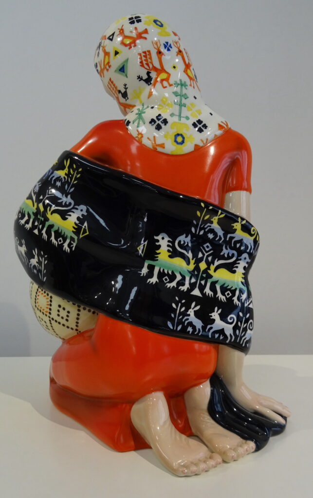 La scultura ritrae una giovane fanciulla dai capelli scuri, seduta sui talloni, con la mano destra appoggiata delicatamente a terra e con il braccio sinistro stretto intorno a una giara. La posizione instabile determina una leggera torsione del corpo che consente di donare alla composizione un senso di movimento sufficiente per rompere la schematicità dell’insieme e indurre l’osservatore a ruotare intorno alla scultura. La visione circolare della terraglia permette di apprezzare l’altissima qualità tecnica che è stata necessaria per la realizzazione della decorazione pittorica: se per la colorazione del lungo abito con maniche corte si è optato per un rosso vivace e intenso, messo in risalto dalla luminosità vitrea del rivestimento, per la definizione dello scialle che le avvolge le spalle e del fazzoletto che le copre la testa si è fatto ricorso a due elaborati motivi ornamentali composti da animali e da elementi floreali e vegetali stilizzati e variopinti, liberamente ispirati ai tessuti della cultura tradizionale sarda e delle regioni del Sud Italia. Anche il vaso dalla forma circolare è descritto con cura, dipinto con un motivo geometrico a pois in bicromia che rimanda a stilemi arcaici.