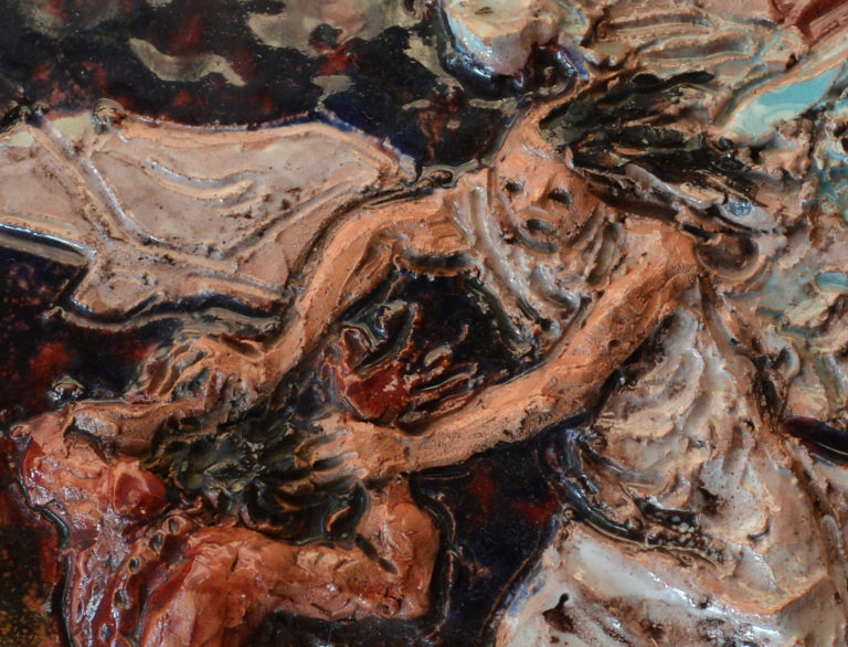 Il piatto decorativo, concepito come un vero e proprio pannello scultoreo in bassorilievo, è un pezzo unico in terracotta lavorata alla stecca e dipinta con smalti densi e corposi che accentuano il carattere materico del modellato plastico, trattato con una forte valenza espressiva e con un linguaggio affine alle sperimentazioni informali portate avanti da Lucio Fontana in quel medesimo torno d’anni.