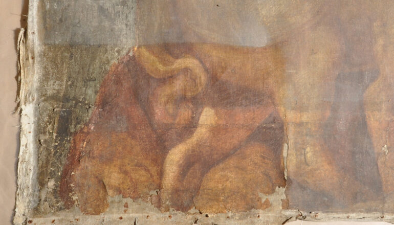 17. Tensionamento della tela con l’Assedio di Betulia prima dell’applicazione del nuovo telaio.