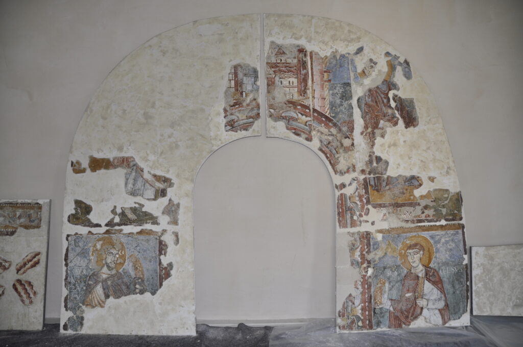 I frammenti (cfr. Franco 2010, pp.29-37, cat.2) costituiscono ciò che rimane del secondo strato pit-torico che decorava il sacello di San Michele, presso la chiesa dei Santi Nazaro e Celso. Il ciclo, di carattere cristiano, venne strappato nel 1885 dal pittore Gaetano Pasetti. Fu l’Ispettore Carlo Cipol-la a sollecitare il trasferimento degli affreschi all’interno del Museo Civico: l’umidità e l’esposizio-ne alle intemperie rendevano infatti l’ambiente particolarmente dannoso per la conservazione delle pitture, che andavano deperendo.