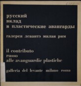 Il volume, edito in occasione della mostra tenutasi nel 1964 presso la Galleria del Levante di Milano, si apre con una presentazione di Carlo Belloli, Il contributo russo alle avanguardie plastiche (settembre 1964). Segue il catalogo delle opere esposte, ordinato per autore e accompagnato da una selezione di riproduzioni fotografiche delle stesse, per un totale di ottantacinque riproduzioni in bianco e nero. Inoltre, all’interno di tale elenco sono indicate con titolo corsivo le opere non presenti in mostra, ma che il curatore ha ritenuto di segnalare in considerazione della loro rilevanza nel contesto dell’avanguardia russa. Segue un Estratto dal regesto generale dell’avanguardia plastica russa e del suo clima, curato da Carlo Belloli, e accompagnato da una documentazione fotografica in bianco e nero (58 riproduzioni). Il catalogo si chiude con le Sintesi biografiche ragionate degli artisti espositori e l’indice del volume.