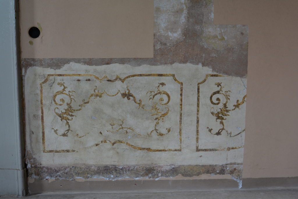 La decorazione delle pareti, benché in larga parte scomparsa, è ancora leggibile in alcuni lacerti situati nella parte bassa delle mura. Questi, che presumibilmente dovevano far parte di un alto zoccolo sopra il quale si sviluppavano altre decorazioni, mostrano una divisione in specchiature e motivi di ispirazione vegetale color oro. Il soffitto si trova in un miglior stato di conservazione e raffigura una volta al cui centro si apre una cupola ovale. L’intera quadratura è abbellita da finti stucchi di gusto rococò, ulteriormente movimentati dalla presenza di inserti vegetali che, sebbene oggi appaiano marroni a causa della degradazione del colore, erano in origine dorati. Della medesima colorazione dovevano essere anche le quattro allegorie dei Continenti poste all’interno dei medaglioni del soffitto.