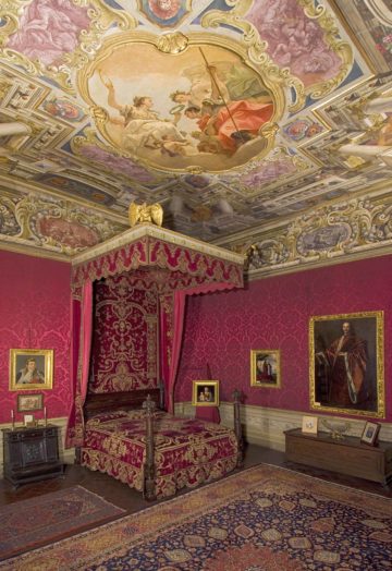 La cosiddetta sala di Napoleone, rivestita da una sofisticata tappezzeria purpurea, ospita un letto a baldacchino di inizio Settecento e mostra un fregio a finto stucco decorato con cartouche e riccioli che racchiude piccoli ovali monocromi e allegorici. Il soffitto presenta una quadratura architettonica con quattro telamoni angolari, inquadrati da coppie di colonne con capitello dorato, che sorreggono la trabeazione delimitata da una cornice dorata; al centro, racchiusa in una cornice dorata circondata da quattro monocromi con allegorie delle virtù, si staglia la tela con l’Allegoria della gloria militare attribuita a Sebastiano Ricci e databile al 1697 (Terraroli 2005-2007, pp. 165-174).