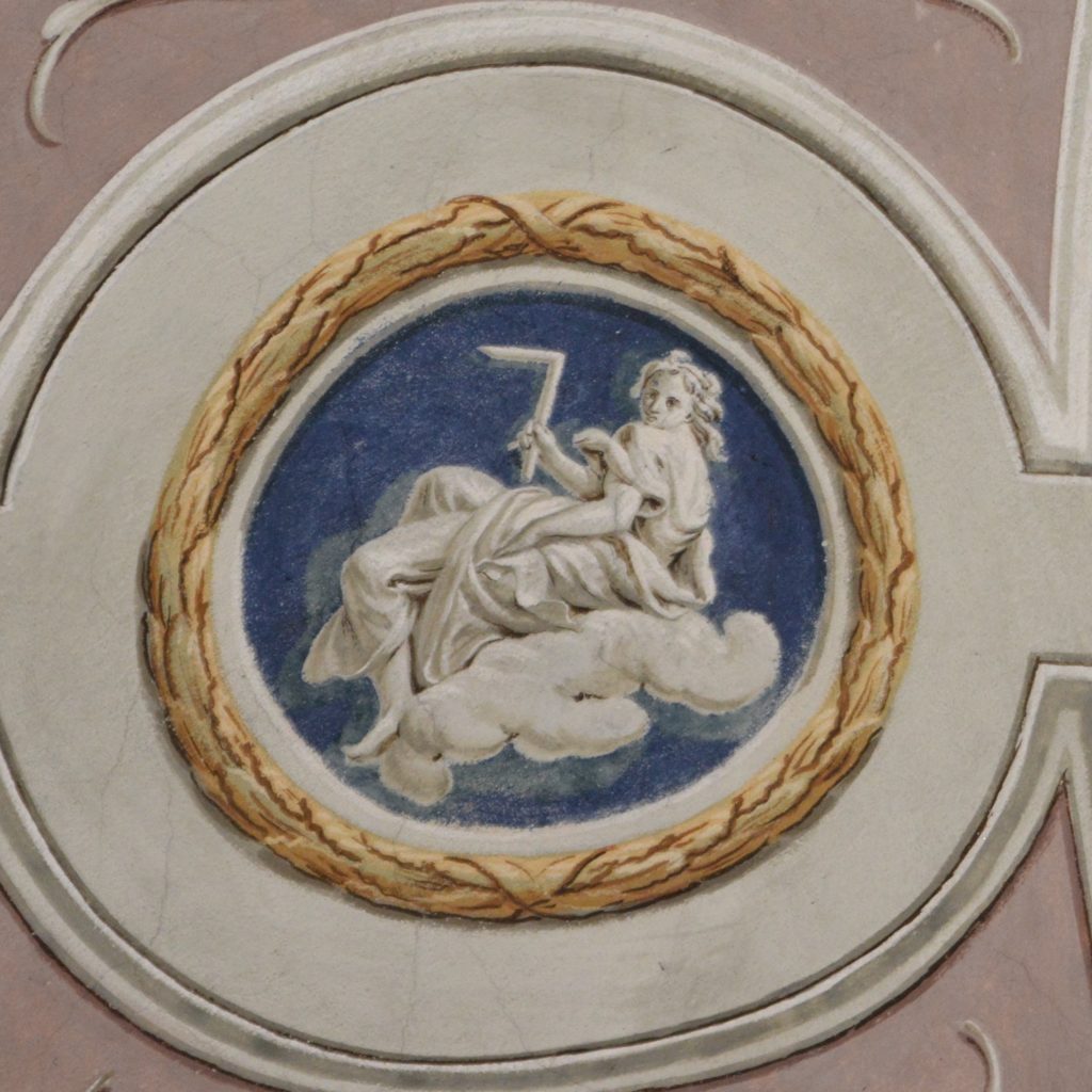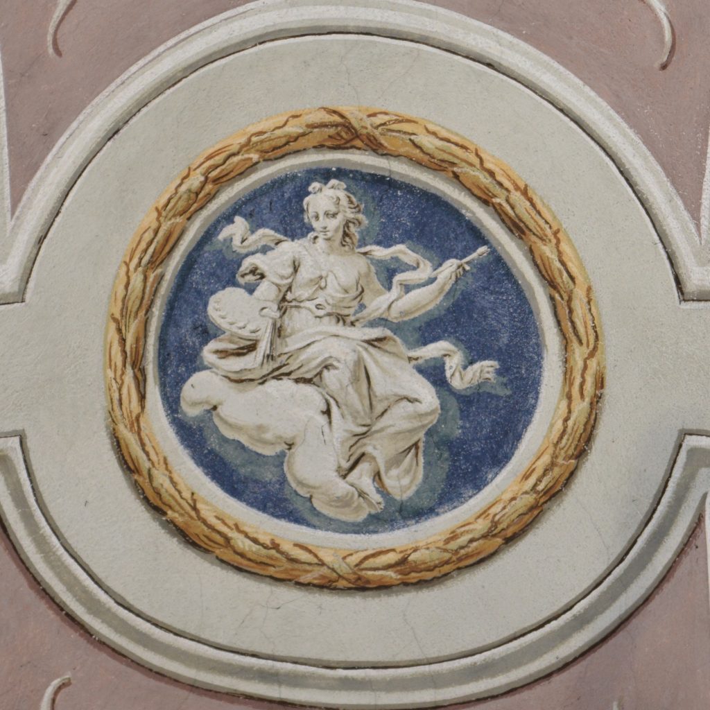 La quadratura architettonica ideata per il soffitto, ancora perfettamente leggibile, suddivide la superficie in specchiature di gusto neoclassico, ornate da foglie d’acanto, festoni, vasi e creature di fantasia dipinti in oro o grisaille su fondi monocromi. Le specchiature negli angoli della volta sono inoltre arricchite da quattro piccoli medaglioni circolari raffiguranti le allegorie dell’Astronomia, della Pittura, dell’Architettura e della Musica.